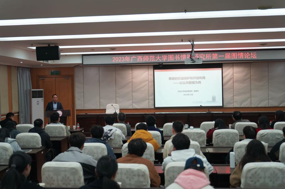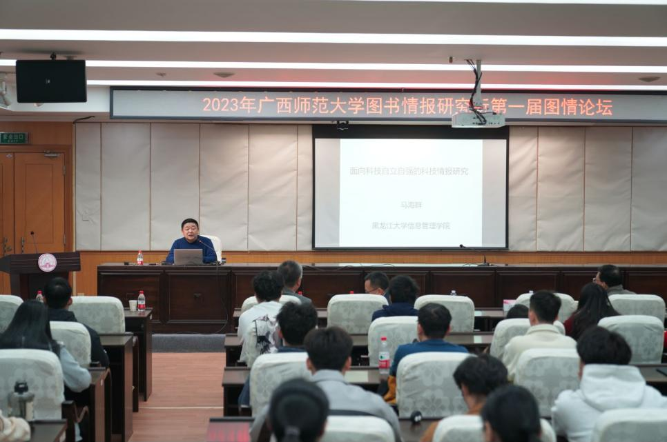 12月1日,由广西师范大学图书馆、广西师范大学图书情报研究所主办的“2023年广西师范大学图书情报研究所第一届图情论坛”于广西师范大学育才校区图书馆1楼报告厅顺利召开。广西师范大学图书馆党总支书记郑国辉出席会议。本次会议分开幕式、主旨报告、专家授课、互动交流四个环节,本校师生、桂林高校图书馆及公共图书馆的学者和同仁等100多人参加会议。