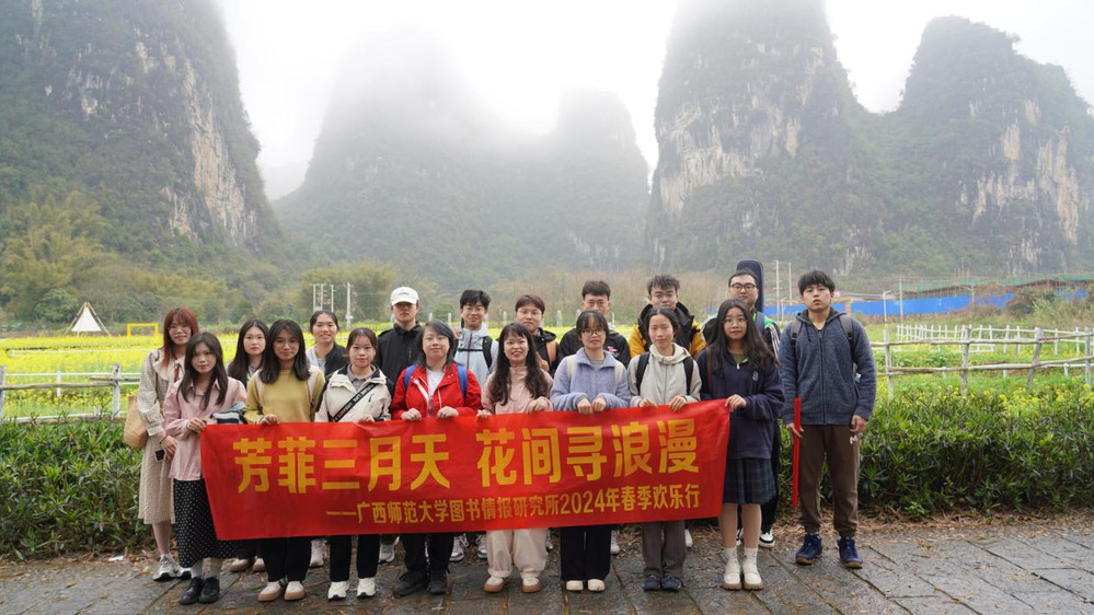 春风和煦,正是户外踏青、感受美好春光的好时节。2024年3月16日,图书情报研究所师生前往桂林阳朔遇龙河,开展“芳菲三月天,花间寻浪漫”春游主题活动。活动由辅导员欧燕老师带领。