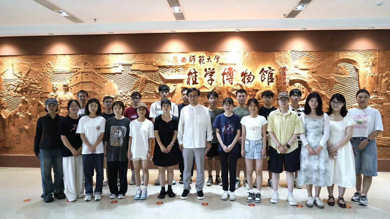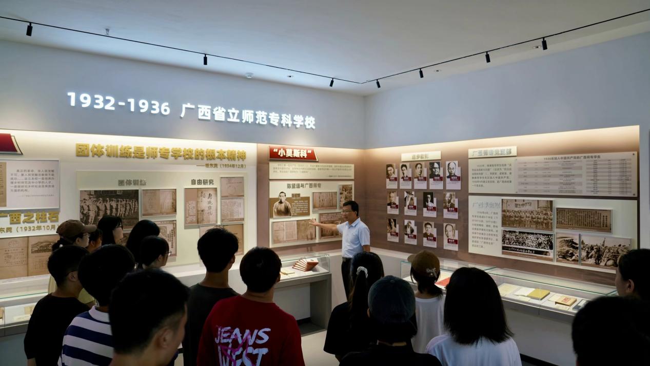 在桂学博物馆,滕大力老师带领新生们依次参观了“人文广西”“文化桂林”“抗战桂林文化城”“八桂学术”“广西当代文学”和“捐赠文物陈列馆”六个专题展厅,为新生们详细介绍文物、手稿、书信、音视频和图书资料等各类展品,全方位、多维度地叙述广西历史,让他们现场领略精深的桂学文化。
