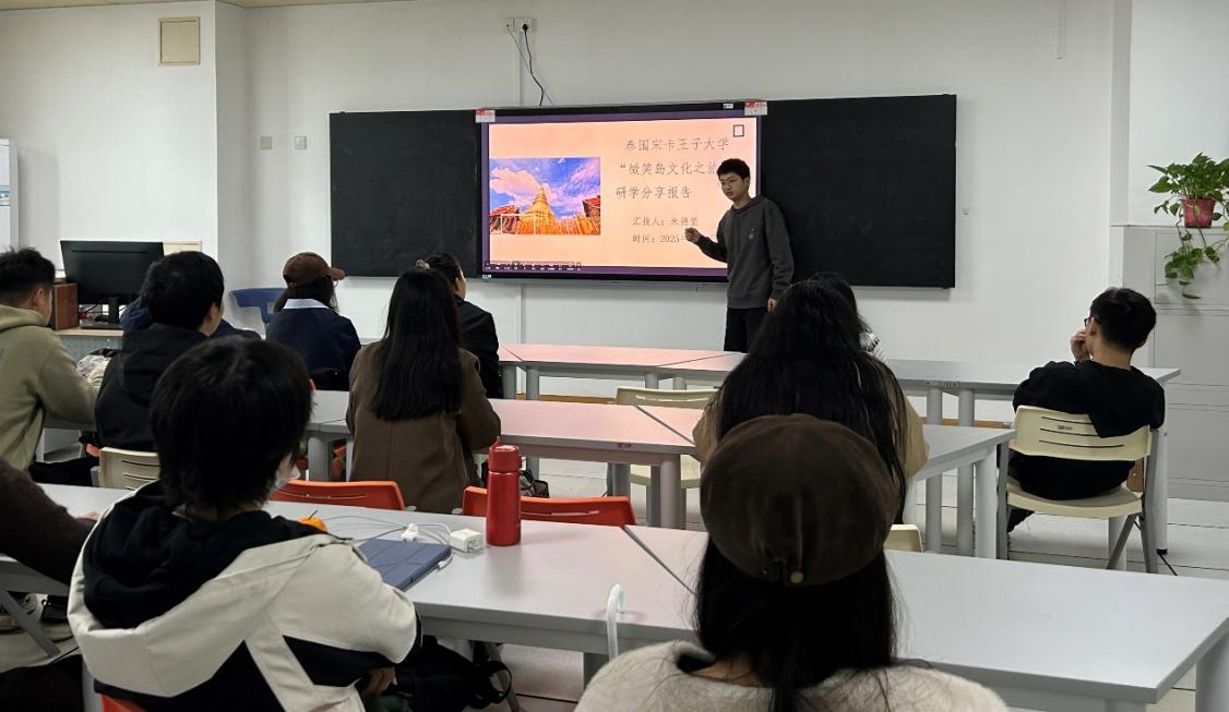 朱德坚同学分享了他在泰国宋卡王子大学的文化体验之旅。他通过照片和视频展现了此次丰富多彩的研学活动,包括参与泰国传统民俗运动、学习基础泰语、体验泰国传统舞蹈以及学习泰国医学知识等。同时,他专门调研了泰国宋卡王子大学合艾校区的图书馆,以调研报告的形式为大家详细阐述了图书馆的建筑空间设计特色、丰富的馆藏资源以及所提供的多元化服务,并对中泰两国高校图书馆的差异进行了对比分析,旨在挖掘图书馆建设方面值得借鉴的宝贵经验。此外,他还分享了泰国的宗教文化、饮食习惯以及社会风貌,全方位、多角度展示了泰国文化的独特魅力。