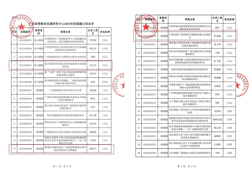4月8日,《广西高等教育发展研究中心2025年度课题立项名单》公布,我所朱会华老师的《地方高校学科发展力的形成机理与实践路径研究》课题获重点课题立项,蒋继平老师的《智慧知识服务提升广西高校教师数字素养的作用机制与实践路径》课题获一般课题立项,符荣鑫老师的《AI驱动的广西高校学科数据监测与应用研究》课题获一般课题立项。