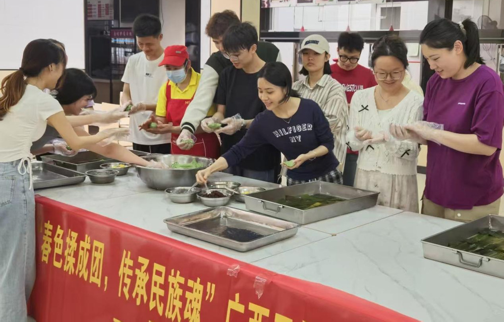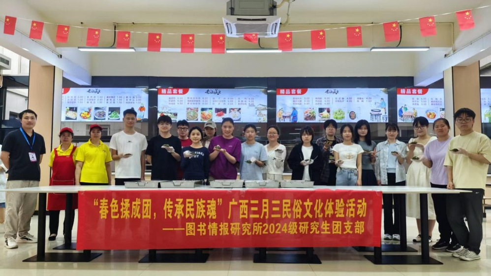 为贯彻落实习近平总书记关于加强和改进民族工作的重要思想,铸牢中华民族共同体意识,庆祝“广西三月三”传统节日,4月11日下午,图书情报研究所2024级研究生团支部在育才校区东苑食堂成功举办“春色揉成团,传承民族魂”——广西三月三民俗文化体验活动。2024级研究生团支部全体成员参加了此次活动,活动由兼职辅导员陆雯主持。
