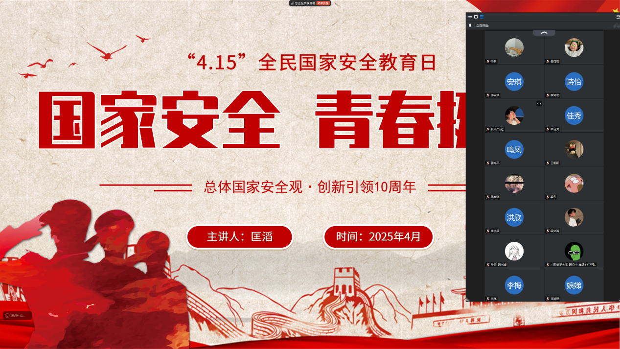2025年4月15日是第十个全民国家安全教育日。为引导广大团员树立正确的国家安全观,激发团员们维护国家安全的责任感与使命感,4月15日当天,图书馆(图书情报研究所)2023级、2024级两个研究生团支部分别以线上和线下的形式开展了以“国家安全,青春挺膺”为主题的全民国家安全教育主题团日活动。