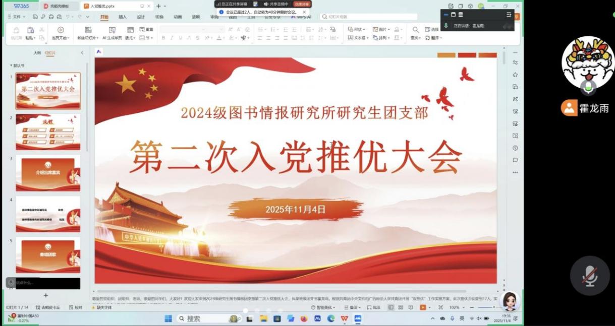 推荐优秀团员成为入党积极分子,是党赋予共青团组织的一项光荣任务。为培养有理想、敢担当、能吃苦、肯奋斗的优秀共青团员,及时为党组织注入新鲜血液,2025年11月4日晚,图书馆2024级研究生团支部在线上召开了2025秋季学期入党积极分子推优大会。辅导员欧老师以及2024级研究生团支部全体成员参会,团支书霍龙雨同学主持会议。
