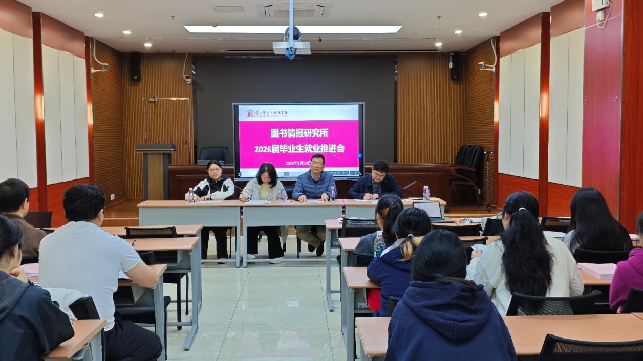 为扎实推进2026届毕业生就业进程,帮助毕业生精准对接社会需求,3月20日上午,图书馆/图书情报研究所在育才图书馆召开了2026届毕业生就业工作推进会。图书馆党总支书记郑国辉、研工部就业与奖助办公室主任张亚静、图书馆副馆长韦敏出席推进会,图情所相关老师及2026届全体毕业生参加。