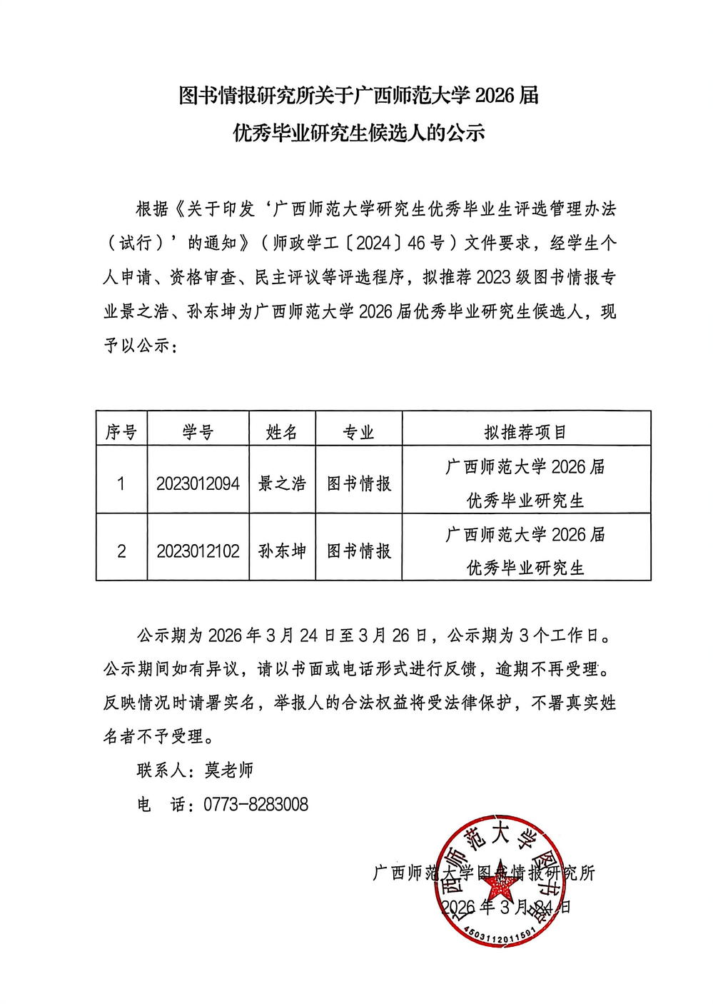 图书情报研究所关于广西师范大学2026届优秀毕业研究生候选人的公示